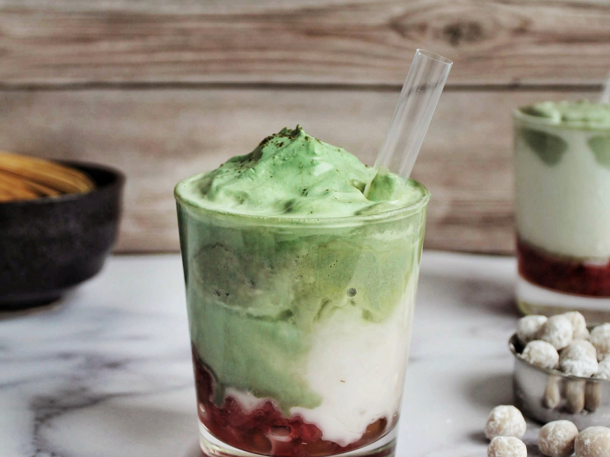 Strawberry Dalgona Matcha Latte with Boba