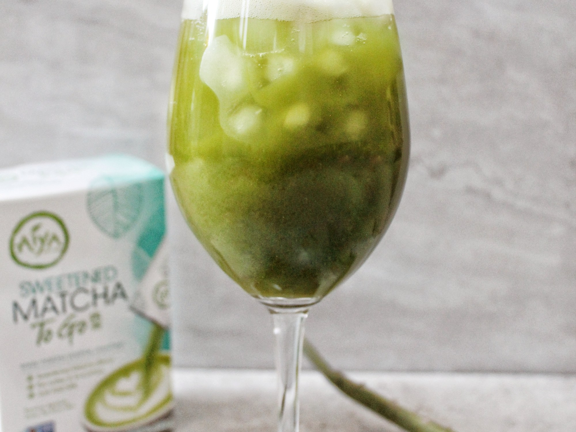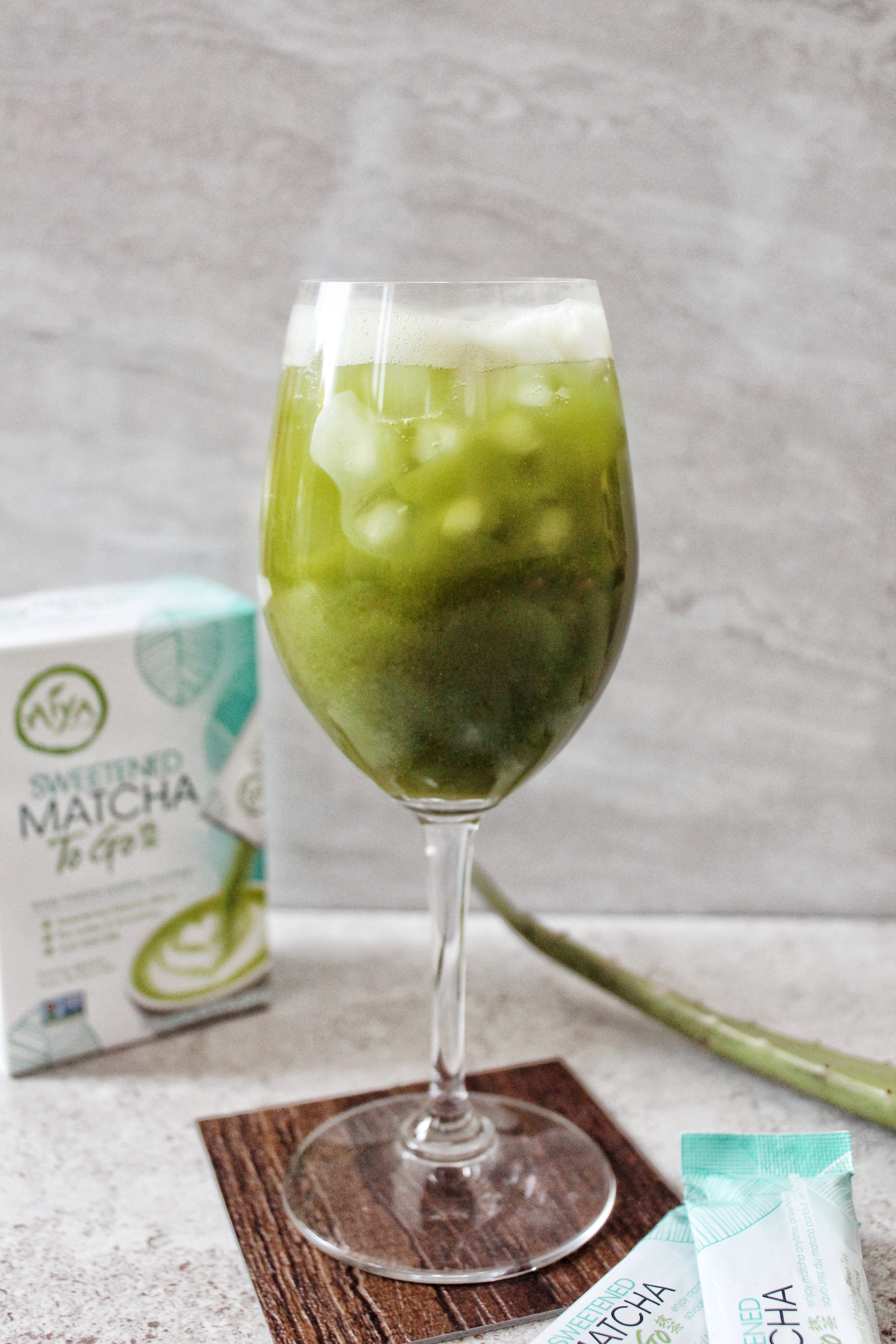 - In a tall glass, add water, juice from 1 lemon, and the Aiya Sweetened Matcha To Go Stick. Using a whisk or a milk frother, mix until evenly combined.